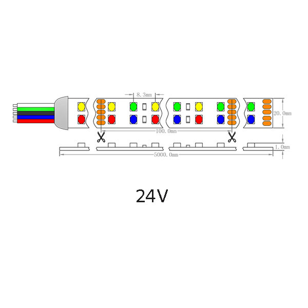 OL-2835FP-24024-RGBARedPremium Epistar SMD 2835 Double Line RGBA Flexible Strip, 240 LEDs/M, 24VDC ONLY, Max 38.4W/M, Max. 1260-1620LM/M at Mix, 120° beam angle, IP43/65/66/68, 20mm wide White flexible PCB, 200MP 3M back tape, 1x20cm 20AWG 5-pin bare wire out, R+G+B+A color, 5M/Roll .