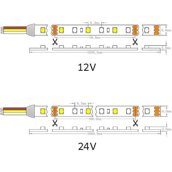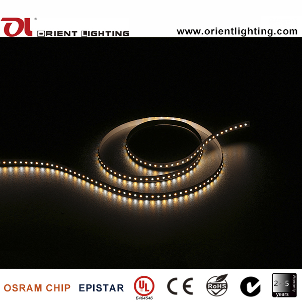 | OL-1210FPC-12012/24-VW | 2700~6500K | Premium Epistar SMD 1210 Color Temperature Adjustable Flexible Strip, 120 LEDs/M, 12/24VDC, Max 9.6W/M, 760-960 LM/M at Mix, 120° beam angle, Common CRI, IP43/65/66/67/68, 10 mm wide White flexible PCB, 200MP 3M back tape, 1x20cm DC connector/1x20cm 20AWG 3-pin bare wire, 2600K-6500K Variable, 5M/Roll. |