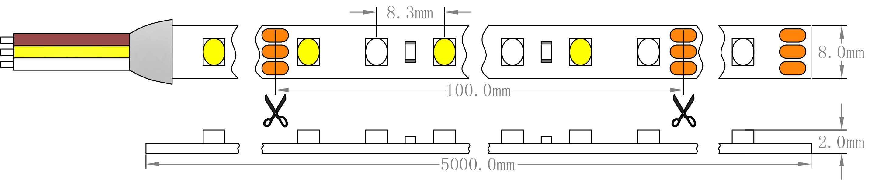 OL-1210FHC-12012/24-VW | 2600K~6500K | High CRI Epistar SMD 1210 Color Temperature Adjustable Strip, 120 LEDs/M, 12/24VDC, Max 9.6W/M, 740-940LM/M at Mix, 120 ° beam angle, CRI>90, IP43/65/66/67/68, 8mm wide White flexible PCB, TESA 4965 back tape, 1x20cm 20AWG 3-pin bare wire, 2600K to 6500K Variable White color, 5M/Roll |