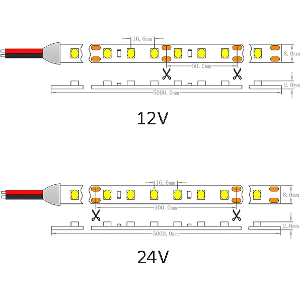 Premium/ Standard Epistar SMD 1210 Flexible Strip, 60 LEDs/M, 12/24VDC, Max 4.8W/M, 360-520 LM/M at White, 120° beam angle, Common CRI, IP43/65/66/67/68, 8mm wide White flexible PCB, 200MP 3M back tape, 1x20cm DC connector/1x20cm 20AWG 2-pin bare wire, R/G/B/UWW/WW/NW/CW, 5M/Roll.